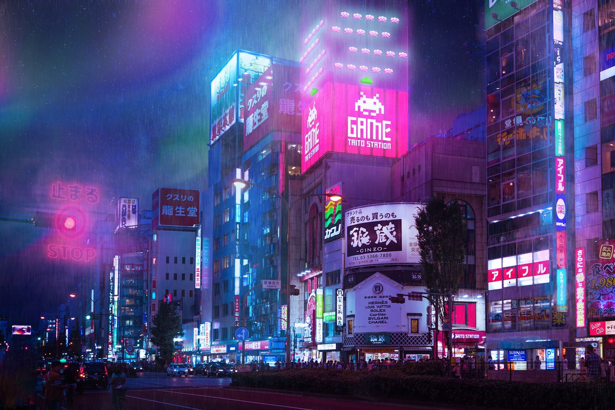 A dark backdrop but shows color through the setting of neo cyberpunk Tokyo.
